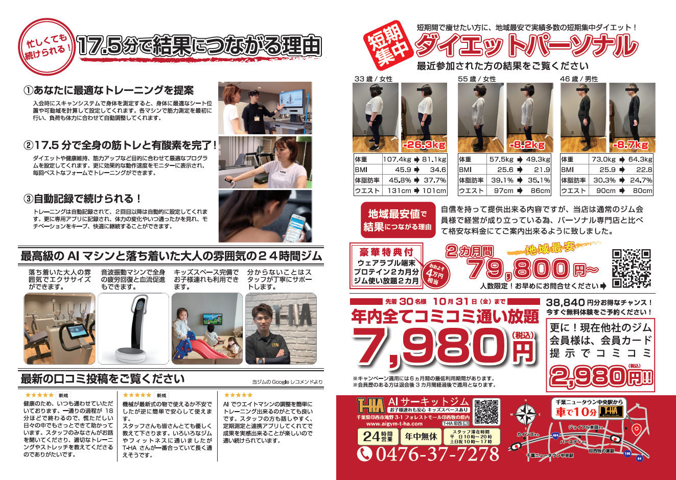 AIサーキットジムT-HAにはキッズルームを併設しています。お子様が遊んでいる間に心置きなくトレーニングが出来ます。体験時、お子様がいらっしゃる時はお菓子をプレゼント!